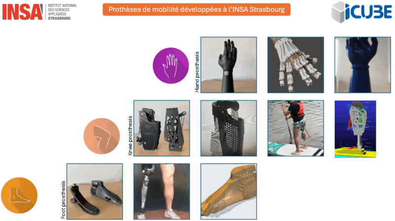Un axe majeur des travaux présentés concerne la conception de prothèses de mobilité. Les recherches menées à l’INSA Strasbourg visent à développer :