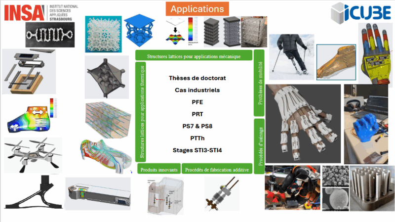 De nombreux travaux de thèses, stages et projets PRT visent à concevoir des structures structures mécaniques, thermiques et fonctionnelles innovantes : absorption de chocs, flexibilité contrôlée, réponse thermique adaptée, comportements fonctionnels complexes. Ces projets mobilisent impression 3D, optimisation topologique et intelligence artificielle.